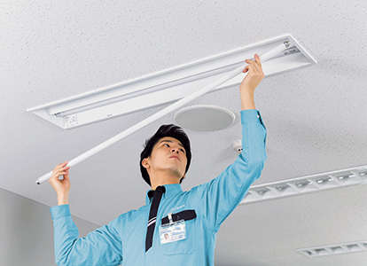 - 照明器具クリーニングサービスは、専用の資器材を使って足場を組み、高所にある照明器具も美しくお手入れ。目には見えない部分についた汚れ、ヤニを落とします。他サービスと一緒にご利用いただくのがおすすめです。